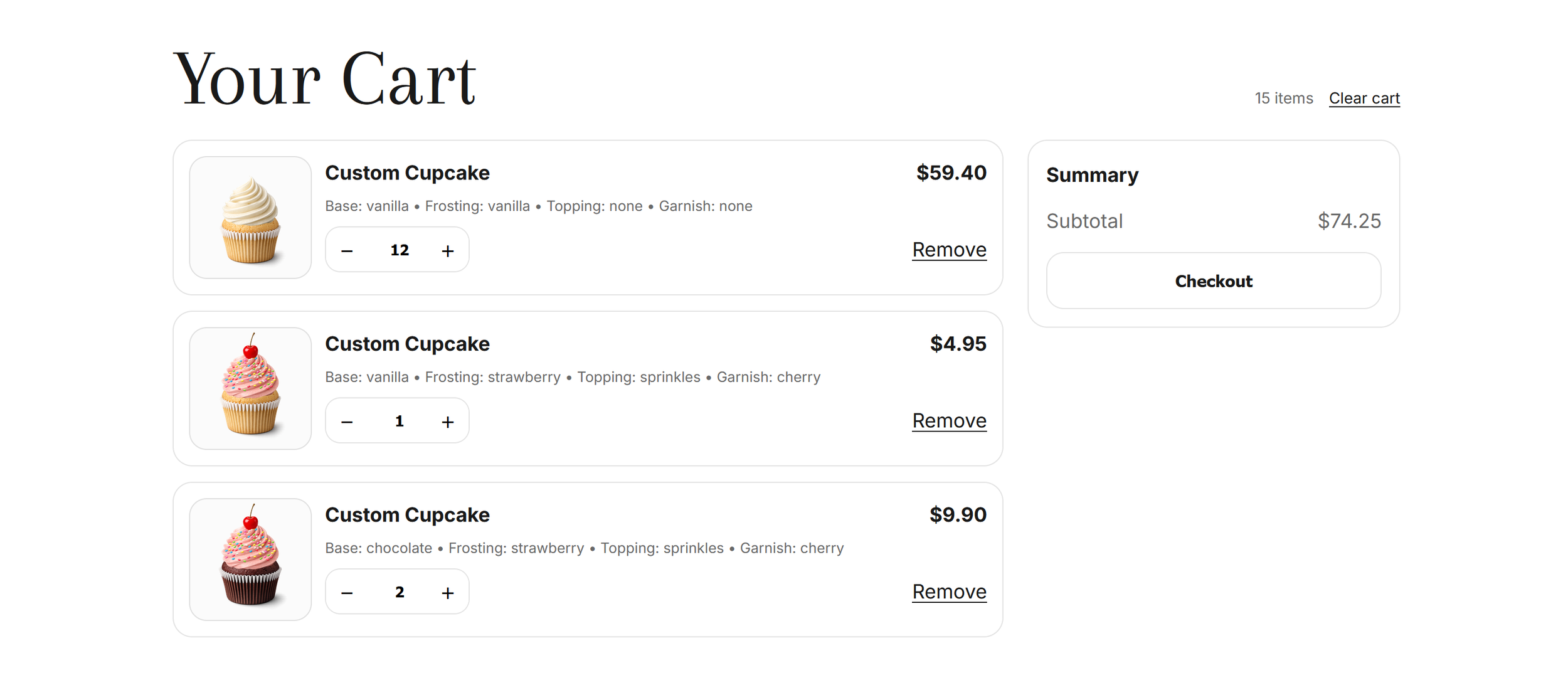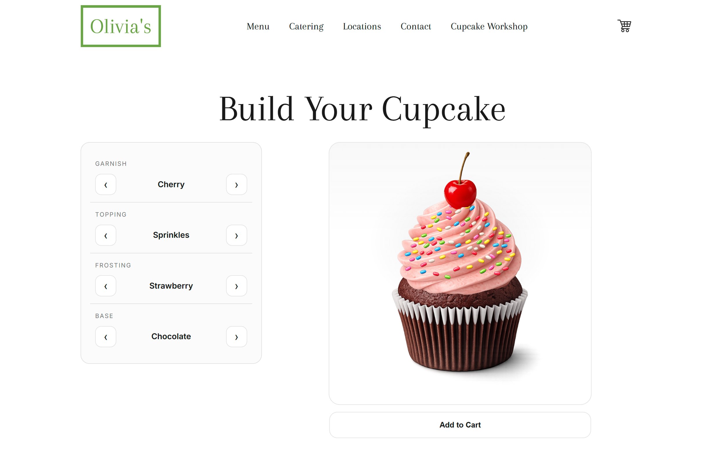 The Cupcake Workshop includes a fully functional add-to-cart flow designed to support custom-built cupcakes. Each cupcake build is treated as structured configuration data rather than a static product, allowing the cart to accurately reflect a user’s selections for base, frosting, toppings, and garnish.
