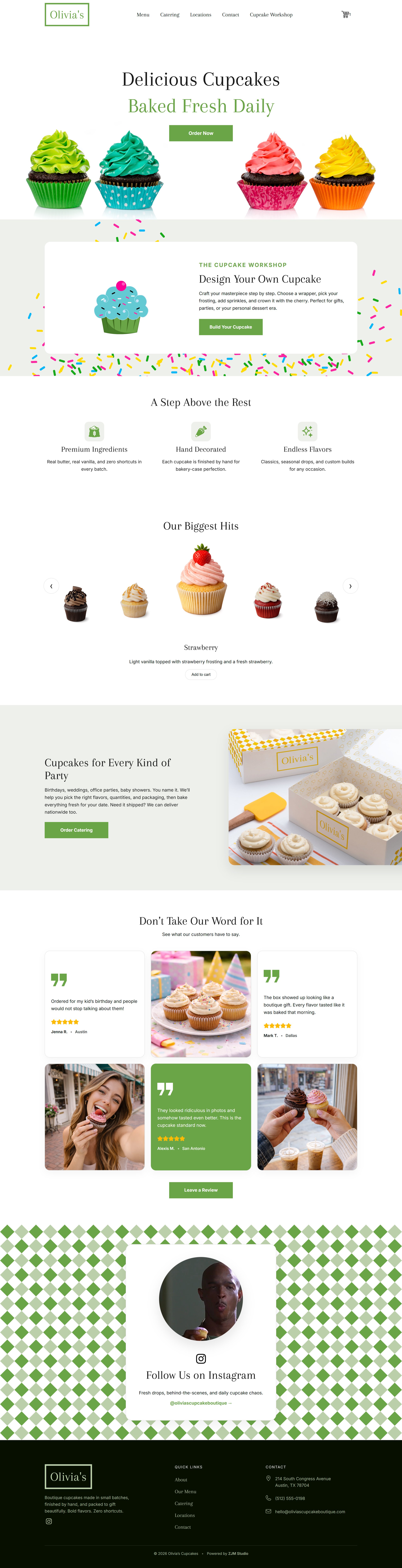 A modern, conversion-focused landing page for a fictional boutique cupcake bakery, built with React and designed to highlight craftsmanship, flavor variety, and catering services while maintaining a refined, editorial aesthetic. The experience emphasizes typography, spacing, and subtle motion to create a premium feel without sacrificing performance or accessibility.